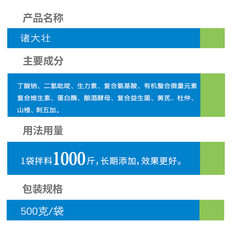 主要成分:丁酸鈉、二氫吡啶、生力素、復(fù)合氨基酸、有機(jī)蝥合微量元素、復(fù)合維生素、蛋白酶、釀酒酵母、復(fù)合益生茵、黃芪、杜仲、山楂、黃精、刺五加。