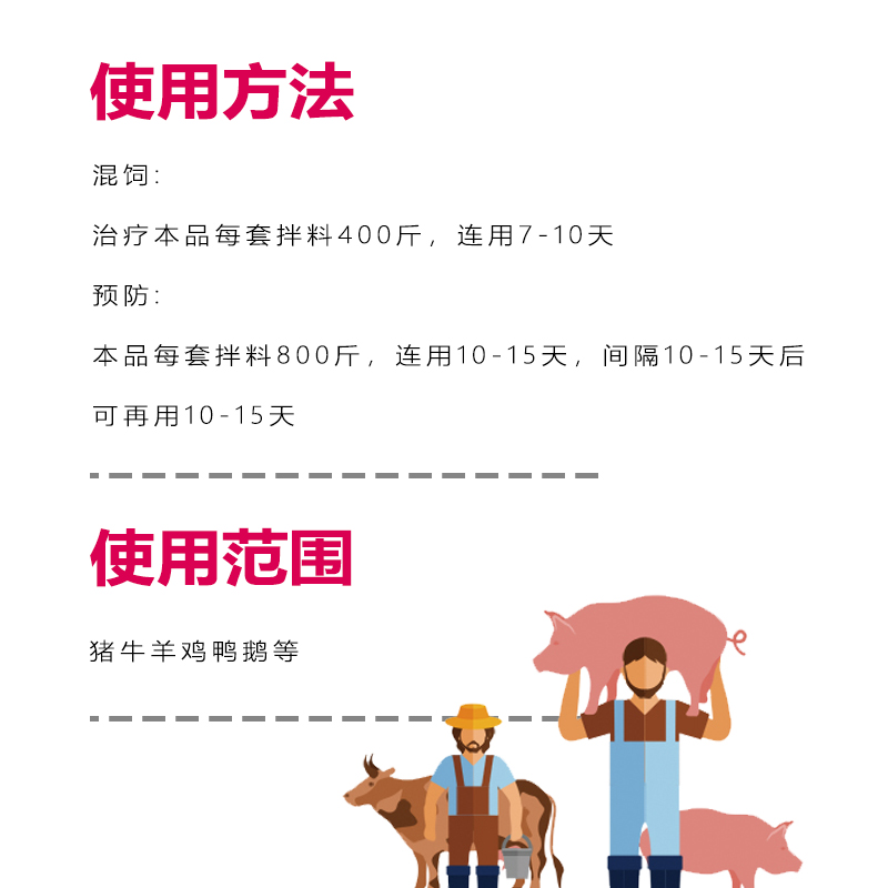 預(yù)防:本品每套拌料800斤,連用10-15天,間隔10-15后,可再用10--15天