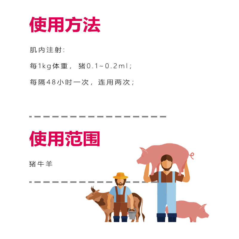肌內(nèi)注射:每1Kg體重,牛0.05ml;豬、羊0.1—0.15ml,一天一次,重癥可連用2-3次。